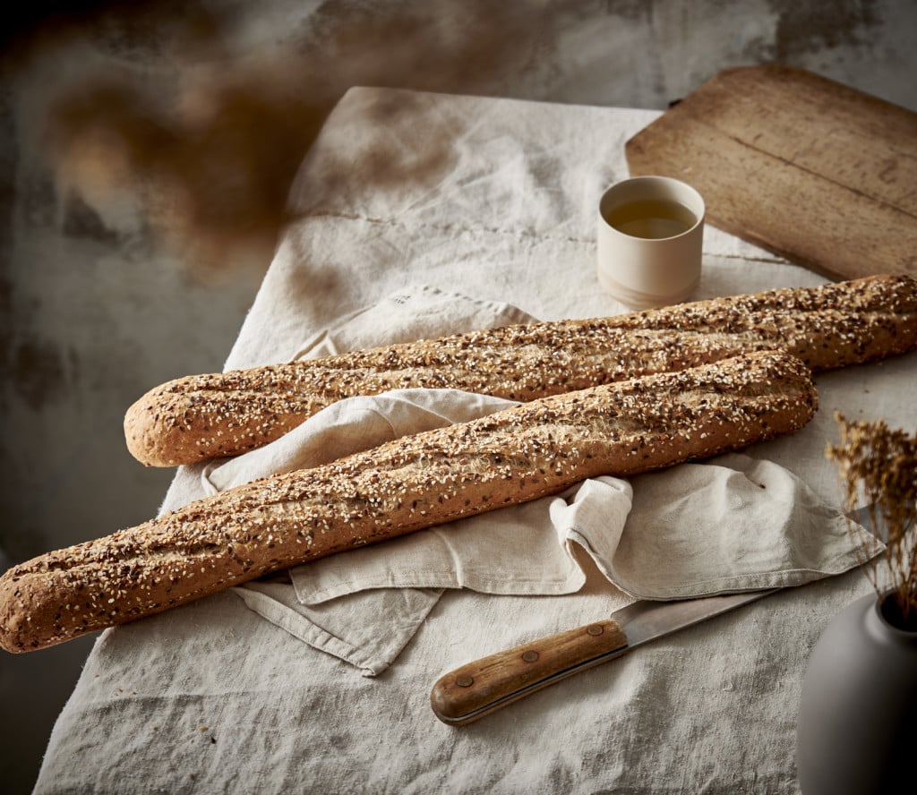 Authentic sourdough multigrain baguette with plenty of seeds and grains: linseed, sesame seed, sunflower seeds, soya flakes, bran wheat and and made from roasted malt flour baked on stone.
