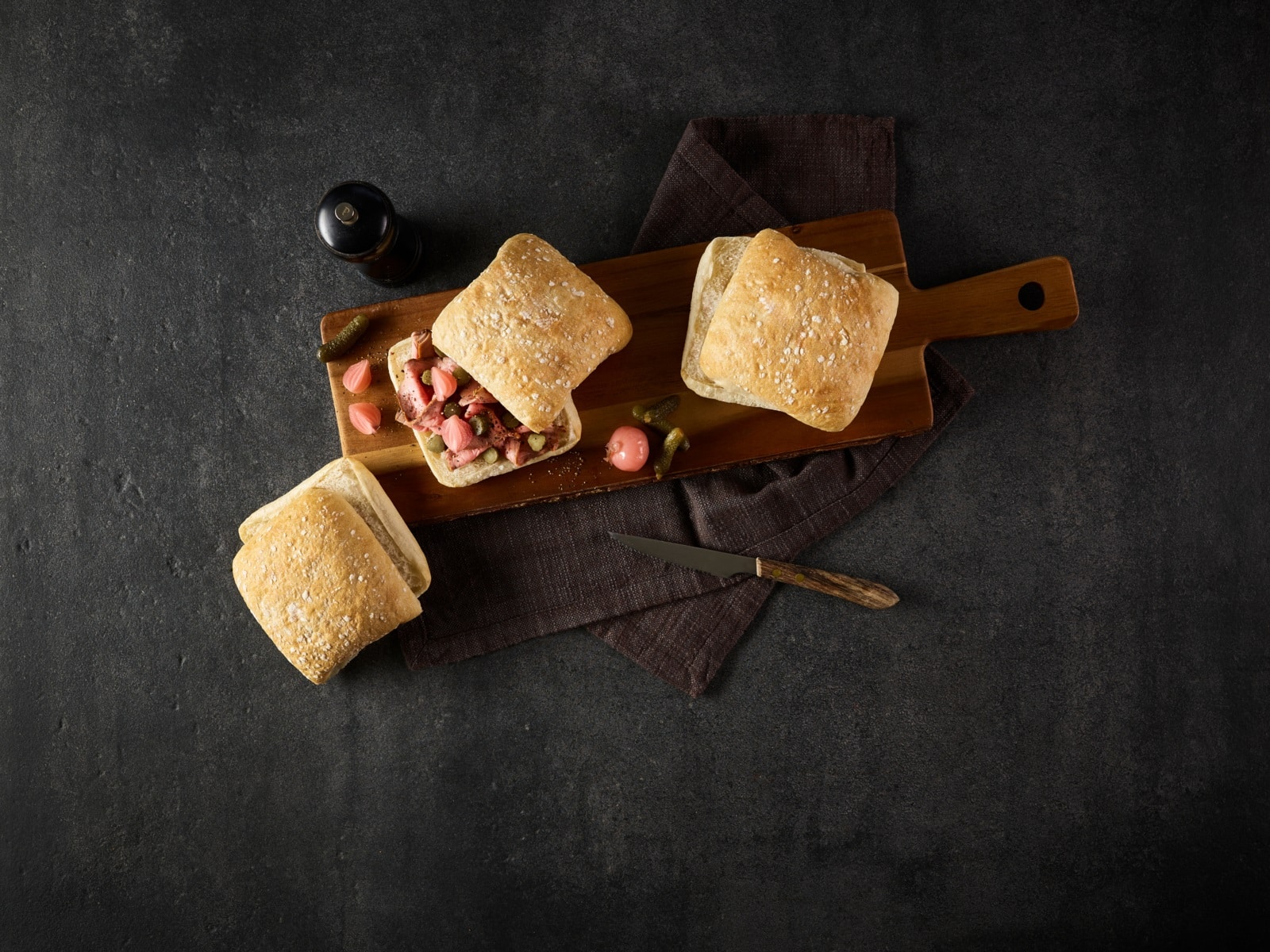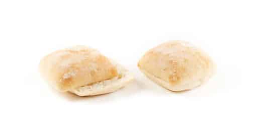 Square, premium burger bun/sandwich roll with a thin, crispy crust and a soft, airy crumb. Made from wheat flour and wheat sourdough, enriched with olive oil. Flour dusted and pre-sliced.