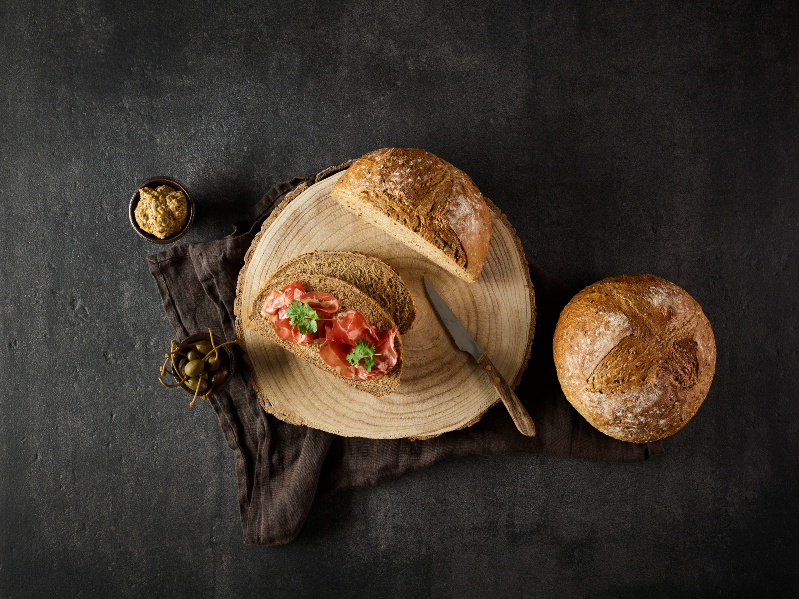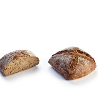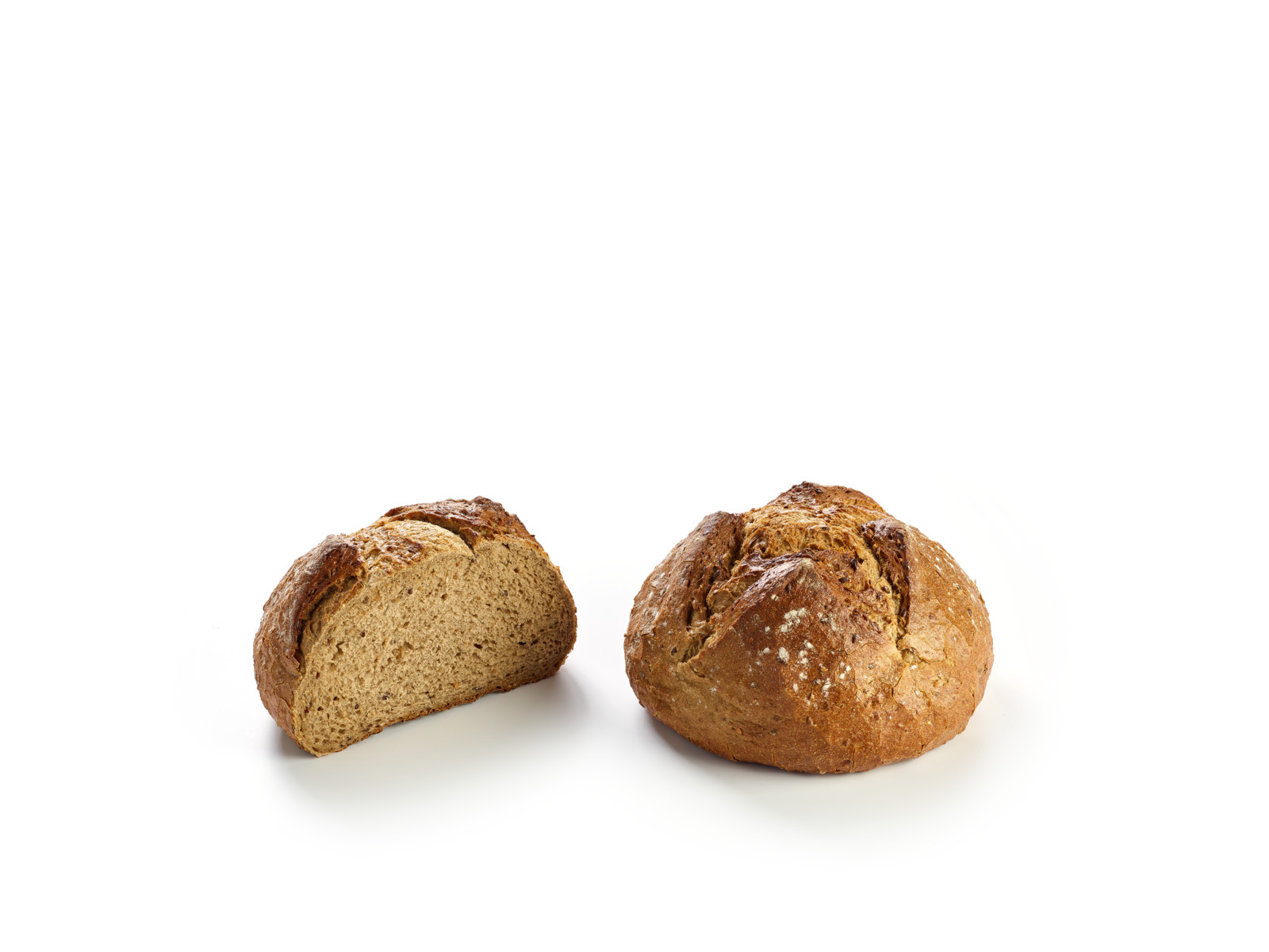 Rustic, round, dark multigrain loaf from wheat flour and rye flour, enriched with oat and rye grains, linseed, pumpkin seeds, sesame seeds and malted oats & malted barley, flour dusted.